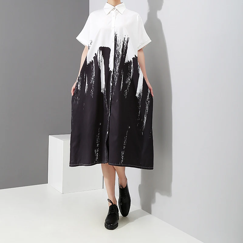 2019 Women Autumn Black And White Shirt Dress Long Sleeve Tie-Dyed Print Lady Plus Size Midi Casual Loose Dress Robe Style 3400