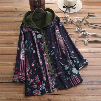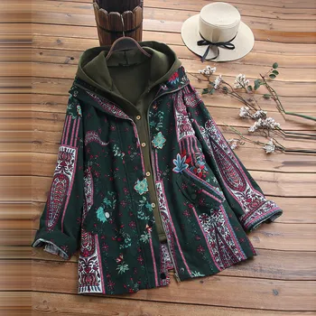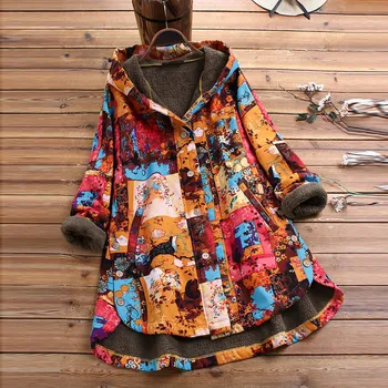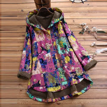 MISSOMO Women Thick Fleece Warm Overcoat Vintage Printed Asymmetrical Button Plus Size S-5XL Hooded Coat Jacket Outwear Female