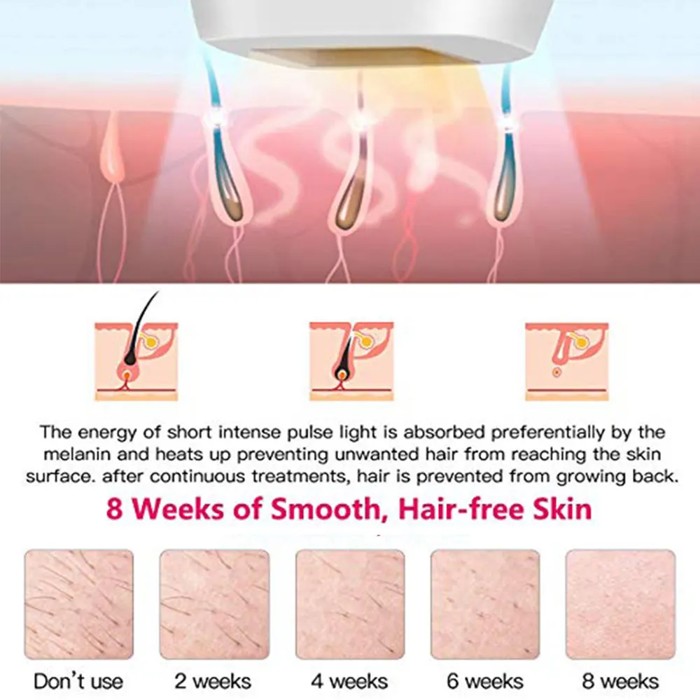 - IPL Technology—Due to its built—in intense pulsed light technology,the IPL Hair Removal Device is effective and painless.The IPL light is absorbed by the melanin in the hair follicle below the skin and can suppress hair growth.No stimulation,nodamage,long-lasting and gentle inhibition of hair regrowth,prociding you with a new experience of efficient and comfortable hair removal.